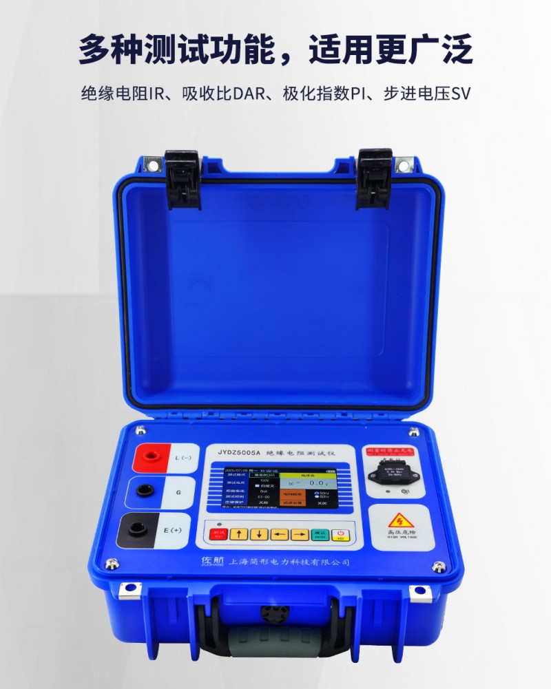 2. 具备6个固定电压量程:100V、250V、500V、1000V、2500V、5000V。自定义电压模式50V~5000V连续可调,步进电压10V。